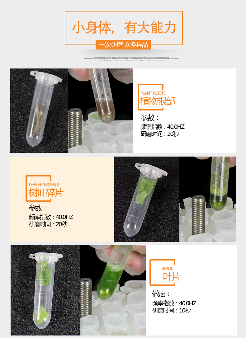 1.適用于各種植物組織包括根、莖、葉、花、果、種子等樣品的研磨破碎;